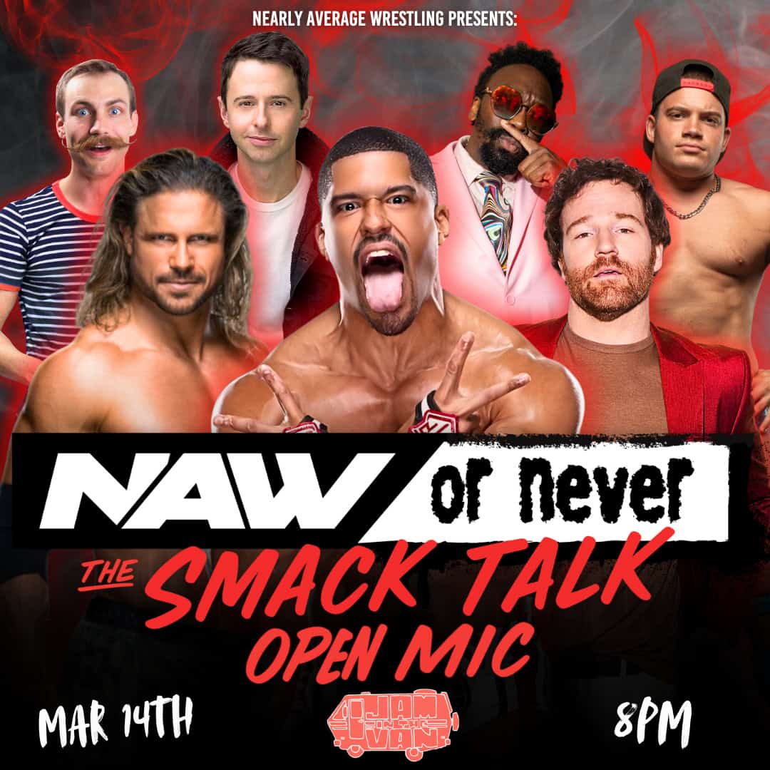 NAW or NEVER is a comedy meets wrestling chaos show where anyone can jump in (or just watch) for a shot at the Nearly Average Wrestling roster. Names go in a bucket, you get 60 seconds on the mic to cut a promo and swing for the fences, and the room decides who earns a NAW “contract.” Past guests include Taran Killam, Ron Funches, Reggie Watts and more, plus surprise drop ins from WWE, AEW, and beyond so you never know who will show up or what will happen.