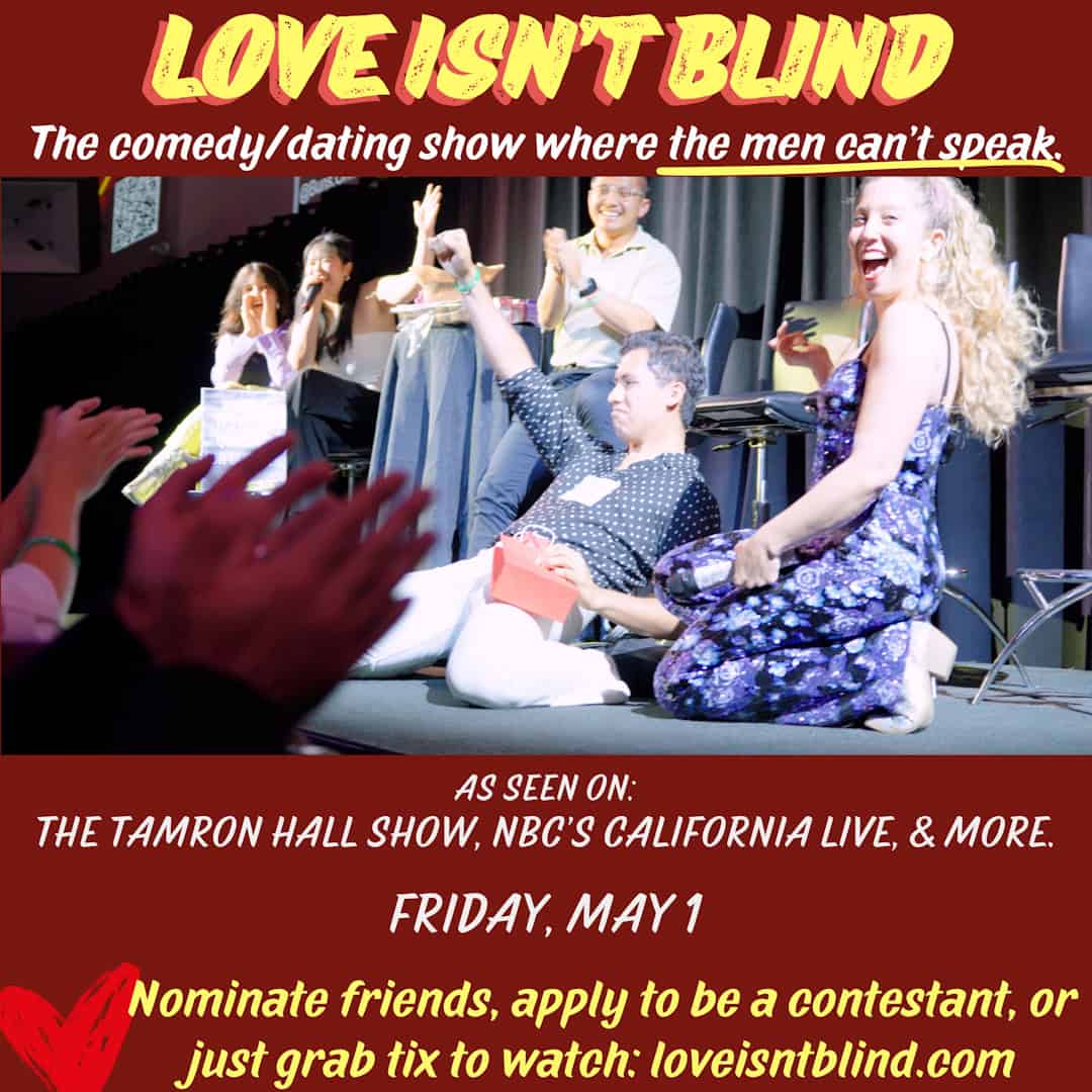 Tired of swiping? In this dating experiment, men compete on stage for one lucky bachelorette, with the little caveat that the men can’t speak. Through a series of games – which includes calling the boys’ moms and unlocking their phones – we narrow it down to two men. Finally, we hear their voices, and the lucky winning man is sent with our bachelorette to the bar for an immediate date. Audience members wear wristbands according to their relationship status, and a wingcouple (who wears actual wings) helps those of you who are too shy to make a move. This show has been featured on The Tamron Hall Show, in LA Magazine, Time Out, CBS, and more.